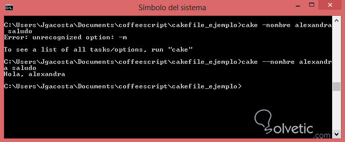 Aquí pasando algo peculiar y es que antes de ejecutar la tarea utilizamos la opción con un solo guion, dándonos un error y es lo correcto ya que en nuestra tarea hemos definido la opción como ---nombre en vez de –nombre, demostrando así la eficacia de CoffeeScript para el funcionamiento de las tareas.