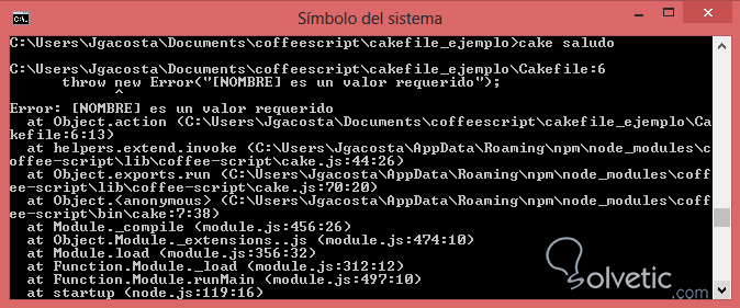 console.log "Hola, #{options.nombre}"Vamos entonces a ejecutar nuestra tarea pero esta vez pasando por alto la opción como argumento y veamos la respuesta de la consola:Como vemos el error que incluimos en el archivo fue mostrado pudiendo así validar que las opciones para nuestras tareas sean pasadas como argumentos cuando sean necesarias.