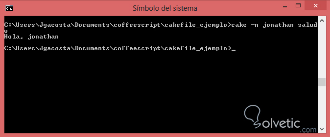 Para ejecutar una tarea con opciones es importante que primero especifiquemos los argumentos y luego el nombre de la tarea ya que si no nos toparemos con un error no dice mucho de lo que pueda estar pasando con nuestro archivo Cakefile, veamos entonces cómo es la ejecución utilizando la segunda opción: