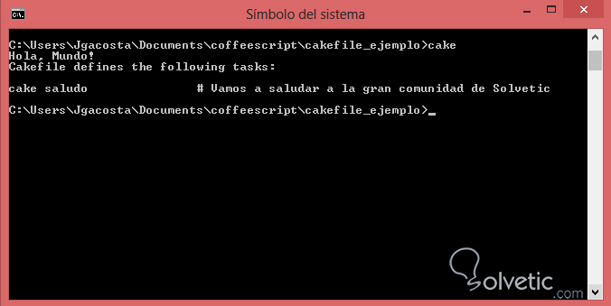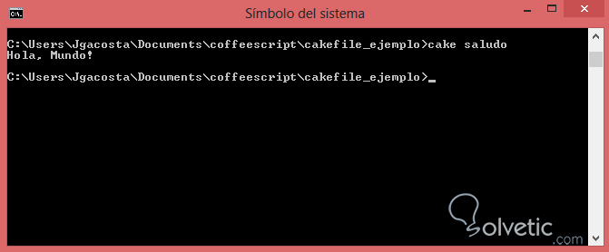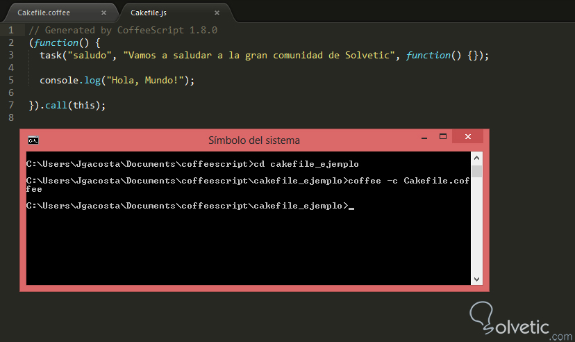 task "saludo", "Vamos a saludar a la gran comunidad de Solvetic", -> console.log "Hola, Mundo!"Antes de explicar nuestro código vamos a compilarlo y ver el contenido generado en JavaScript, esto no es necesario ya que nunca estaremos viendo este código, pero en esta ocasión no nos vendría mal para entender de mejor manera que está haciendo CoffeeScript, veamos la salida: