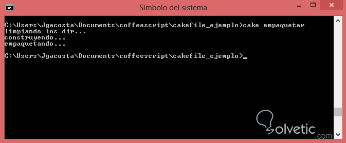 task "limpiar", "Esta tarea realiza la limpieza de los directorios", -> console.log "limpiando los dir..." task "construir", "Construye y compila los archivos para el proyecto", -> console.log "construyendo..." task "empaquetar", "limpia, construye y empaqueta nuestro proyecto", -> invoke "limpiar" invoke "construir" console.log "empaquetando..."Ahora solo debemos llamar a nuestra empaquetar y de esa forma nos aseguramos que las otras dos tareas requeridas sean llamadas sin problemas, veamos la salida en la consola de comandos: