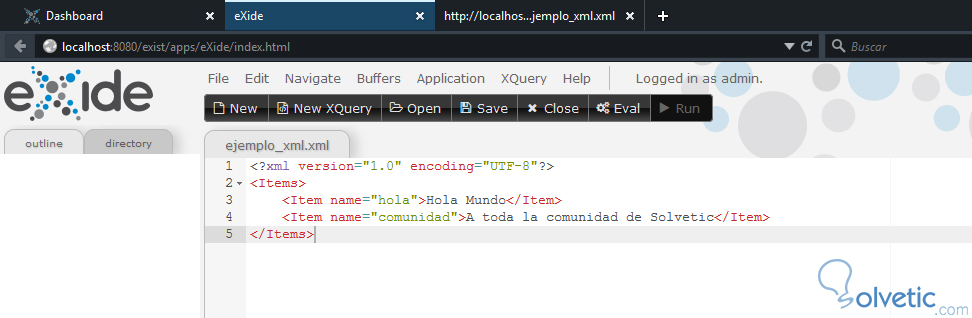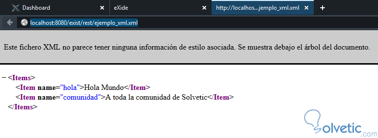 <?xml version="1.0" encoding="UTF-8"?><Items> <Item name="hola">Hola Mundo</Item> <Item name="comunidad">A toda la comunidad de Solvetic</Item></Items>Cómo vemos es un archivo XML simple con una serie de etiquetas y atributos, el cual debe lucir de la siguiente forma en nuestro editor de eXide: