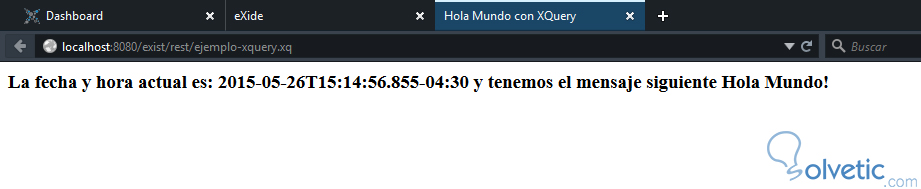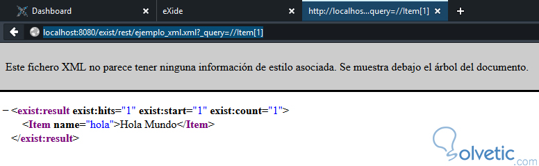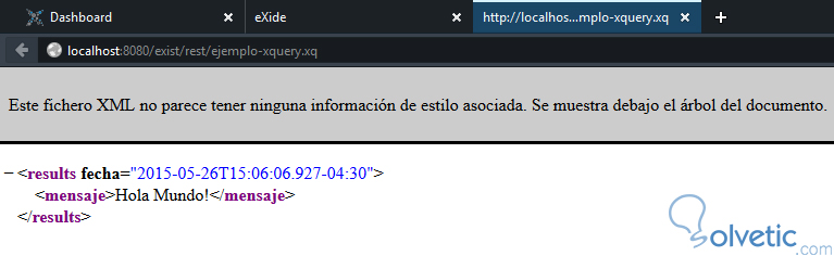 </results>Por último lo que hacemos es utilizar nuevamente nuestra interfaz REST para acceder a él contenido de nuestro documento, veamos la respuesta del navegador:Además de esto podemos mostrar nuestro resultado como una página HTML, lo cual es llamado serialización, para ello solo debemos cambiar nuestro código por el siguiente y utilizar la opción declare para activar la funcionalidad, veamos el nuevo contenido de nuestro documento: