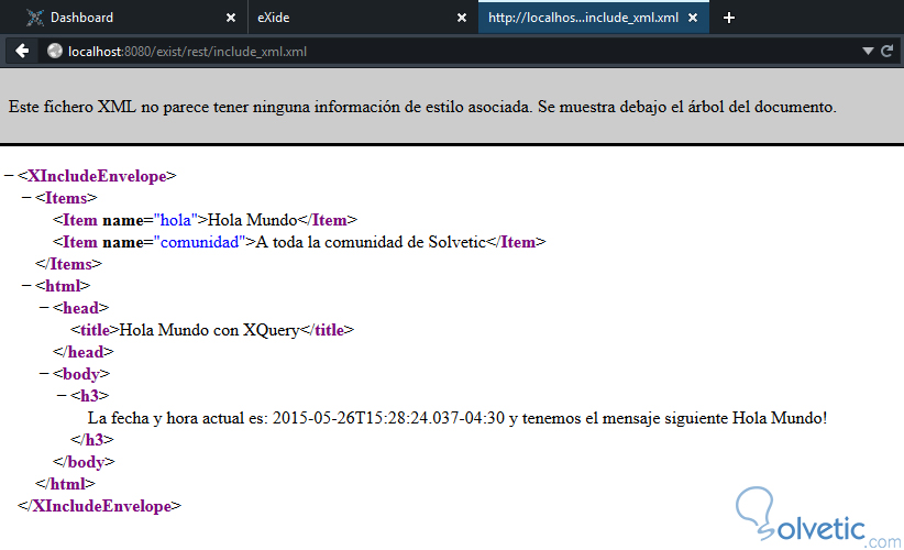<?xml version="1.0" encoding="UTF-8"?> <XIncludeEnvelope xmlns:xi="http://www.w3.org/2001/XInclude"> <xi:include href="ejemplo_xml.xml"/> <xi:include href="ejemplo-xquery.xq"/> </XIncludeEnvelope>Como vemos utilizamos los ejemplos anteriores que hemos construido para hacer las inclusiones en nuestro archivo XML, donde al acceder al mismo desde nuestra interfaz podremos ver ambos resultados en el mismo archivo, veamos: