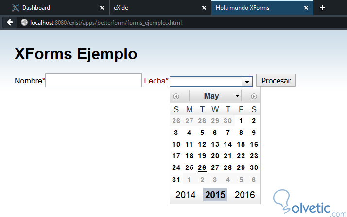 <html xmlns="http://www.w3.org/1999/xhtml" xmlns:ev="http://www.w3.org/2001/xml-events" xmlns:xf="http://www.w3.org/2002/xforms"> <head> <title>Hola mundo XForms</title><!-- The XForms data model: --> <xf:model id="xforms-data-model"> <xf:submission action="procesar.xq" id="submit-id" method="post"/> <xf:instance xmlns=""> <Data> <Name/> <Date/> </Data> </xf:instance> <xf:bind id="NameBind" nodeset="/Data/Name" required="true()" type="xs:string"/> <xf:bind id="DateBind" nodeset="/Data/Date" required="true()" type="xs:date"/> </xf:model> </head><!-- --> <body> <h1>XForms Ejemplo</h1> <xf:group> <xf:input bind="NameBind"> <xf:label>Nombre</xf:label> </xf:input> <xf:input bind="DateBind"> <xf:label>Fecha</xf:label> </xf:input> <xf:submit submission="submit-id"> <xf:label>Procesar</xf:label> </xf:submit> </xf:group> </body></html>Es importante mencionar que todo lo que hagamos con referencia a XForms debe estar almacenado en apps/betterform ya que sino la aplicación no tendrá acceso al mismo, así como la extensión debe ser .xhtml para poder funcionar de manera correcta. Veamos nuestro ejemplo cuando lo ejecutamos en el navegador: