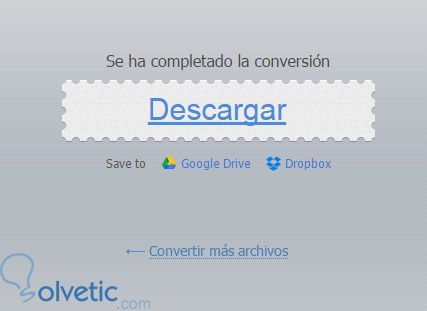 4- Luego de hacer nuestras selecciones, y de realizar alguna información con respecto a la información de nuestra canción, pulsamos el botón Convertir y la aplicación luego de hacer este proceso nos dará la opción de descargar el archivo o guardarlo en Google Drive o Dropbox: