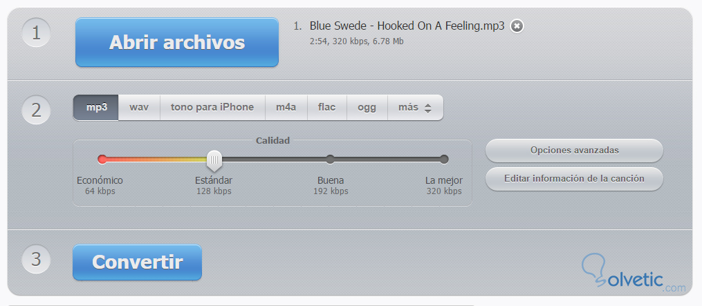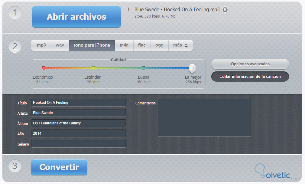 3- Luego de esto seleccionamos el formato de salida, donde además de esto podemos seleccionar la calidad del mismo. También podemos editar la información de la canción, dándonos muchas más opciones para personalizar nuestra conversión: