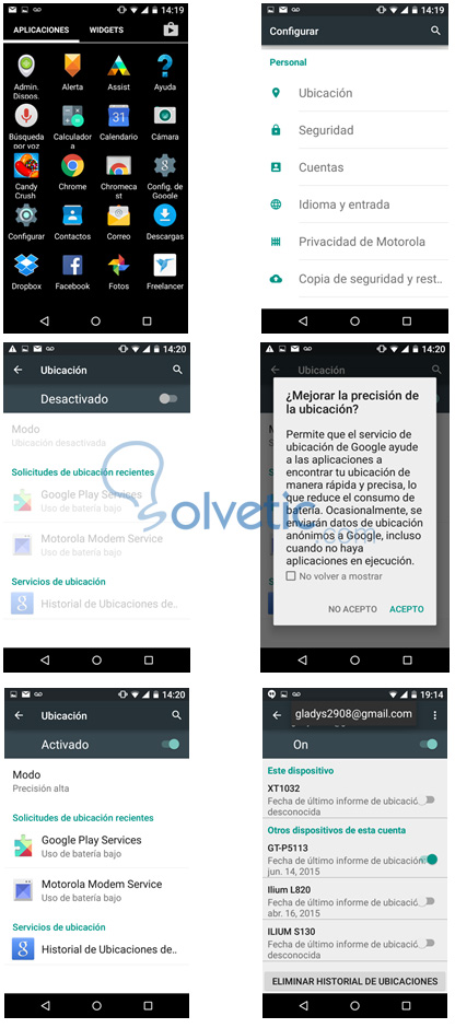 - El dispositivo Android debe tener activada la opción de Ubicación para ello navegue ejecutando la siguiente ruta: Configuración > Personal > Ubicación active la ubicación, acepte las recomendaciones de precisión de la búsqueda de Google y opcionalmente consulte el historial de ubicaciones de los dispositivos Android asociados, tal como se muestra a continuación: