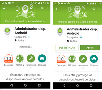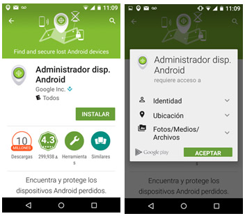 - Android: Si se desea administrar los dispositivos móviles Android desde otro dispositivo Android descargue la aplicación Android Device Manager en la tienda de Android.