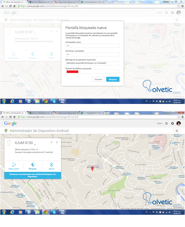 Una vez efectuada la transacción Android Device Manager muestra el mensaje en el cual indica que la solicitud de bloqueo del dispositivo se ha enviado en forma satisfactoria. Observe el par de pantallas que se muestran seguidamente.