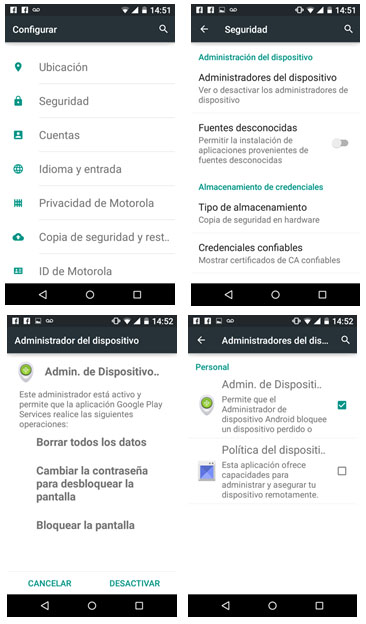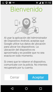 Android Device Manager gestiona los dispositivos Android y permite la configuración de la ubicación y antirrobo con tres diferentes tipos de transacciones que pueden ser activadas en caso de extravío, hurto o robo: