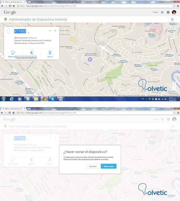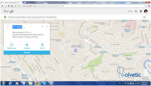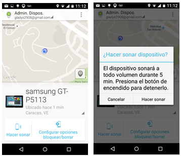 En caso de que uno de los dispositivos Android esté extraviado, seleccione el dispositivo Android en cuestión, verifique la ubicación y a continuación presione sobre la opción Hacer Sonar, tal como se muestra en la ilustración anexa: