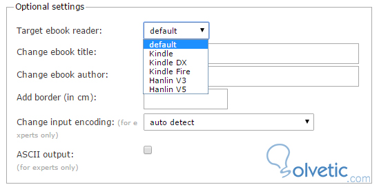 2- Además de esto, tenemos unas opciones adicionales que serán válidas durante la conversión, podemos cambiar el formato destino de acuerdo al dispositivo, cambiar el autor, el título e incluso añadir un borde al mismo: