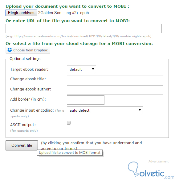 1- Nos dirigimos a nuestro convertidor online y en la interfaz principal podemos subir el ebook que deseamos convertir, cargarlo desde una URL o incluso incluirlo desde Dropbox, en este caso subiremos un .epub pero podemos utilizar otro formato si así lo deseamos: