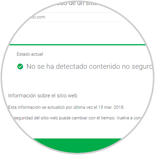 En los resultados podemos ver que nos afirma que el sitio web está libre de contenido malicioso. Google no revisa todo el sitio sino que día a día va revisando alguna paginas de todas la web.