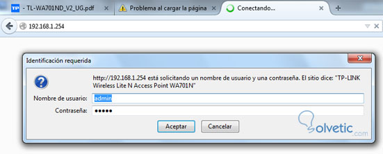 3. Abrimos un navegador de internet y nos conectamos a la dirección IP: 192.168.1.254 saltará para introducir usuario y password. Por defecto son: