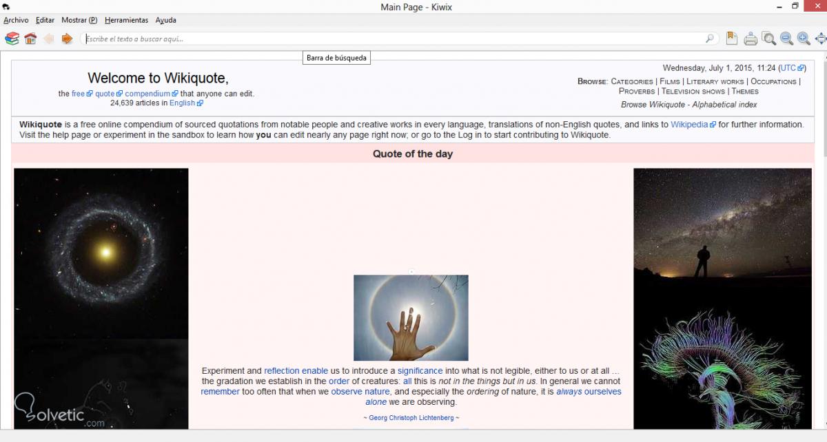 Kiwix lo que hace es permitirnos visualizar el contenido de Wikipedia gracias a su interfaz, basada en un lector HTML. Vamos a descargar alguna de las fuentes, en este caso Wikiquote, ya que tiene un peso de solo 500 mb, y que si lo comparamos con los más de 50 GB de Wikipedia nos viene mucho mejor para darle un vistazo a esta herramienta.
