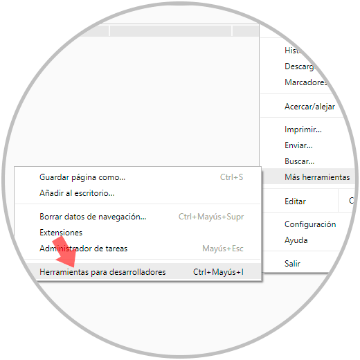 Tendremos un menú en la parte inferior que se desplegará, el cual nos muestra el código HTML de la página. Para mostrar el panel para desarrolladores de Chrome iremos a “Menú / Más herramientas / Herramientas para desarrolladores” o bien haremos la siguiente combinación de teclas: