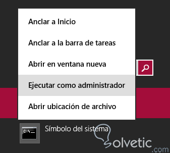Lo primero es abrir una consola del sistema como administrador, para ello colocamos cmd en la búsqueda y haciendo click derecho, seleccionamos “Ejecutar como administrador”: