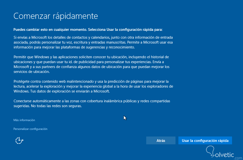 Luego de esto, presionamos el botón de “Configuración rápida” para empezar con el proceso de preparar nuestro entorno. Como nos encontramos en una máquina virtual es posible que los procesos de carga demoren un poco, así que no debemos desesperarnos si vemos que se tarda un poco.