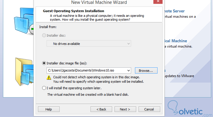 Luego debemos escoger el formato en el cuál tengamos el sistema que queramos virtualizar, para ello marcamos la opción de “Instalar imagen de disco (iso)” y buscamos en nuestro equipo donde se encuentra la imagen de Windows 10.