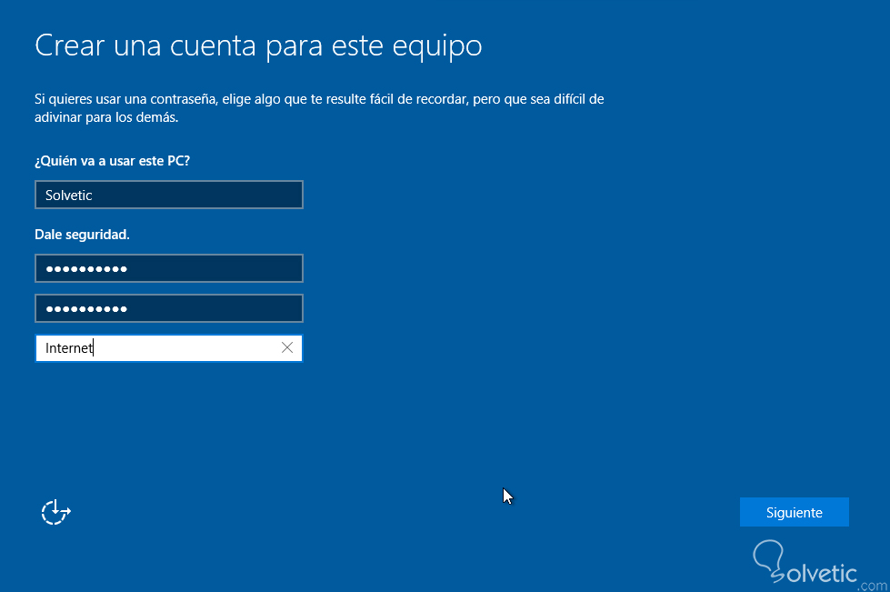 En la pantalla siguiente introducimos nuestra información para el acceso a Windows 10, así como la contraseña y un indicio en el caso que nos olvidemos de la misma y pulsamos “Siguiente”.