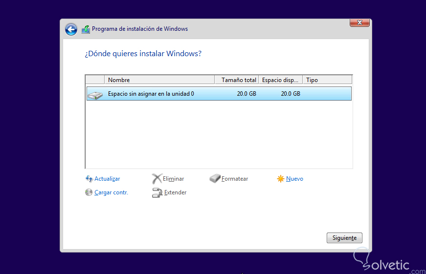 Automáticamente el instalador nos reconoce el espacio designado para la instalación y pulsamos “Siguiente” para continuar con la misma. Este proceso puede tardar unos cuantos minutos pero luego de terminado, nuestra máquina virtual se reiniciará y nos recibirá con nuestra instalación de Windows 10.