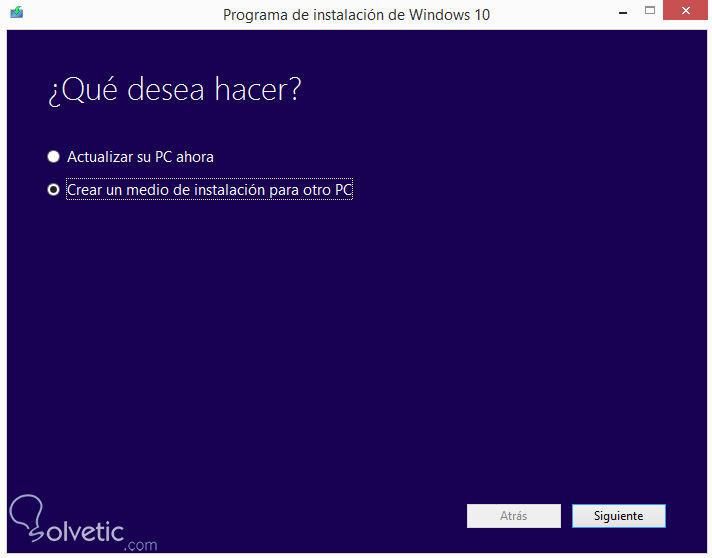 Para obtener Windows 10 y poder crear la máquina virtual debemos descargar la imagen ISO del mismo, para ello nos dirigimos a la página oficial y descargamos la herramienta de creación de medios para Windows 10. Luego de su descarga, la ejecutamos y en el primer paso seleccionamos la opción de “Crear un medio de instalación para otro PC” como vemos en la imagen: