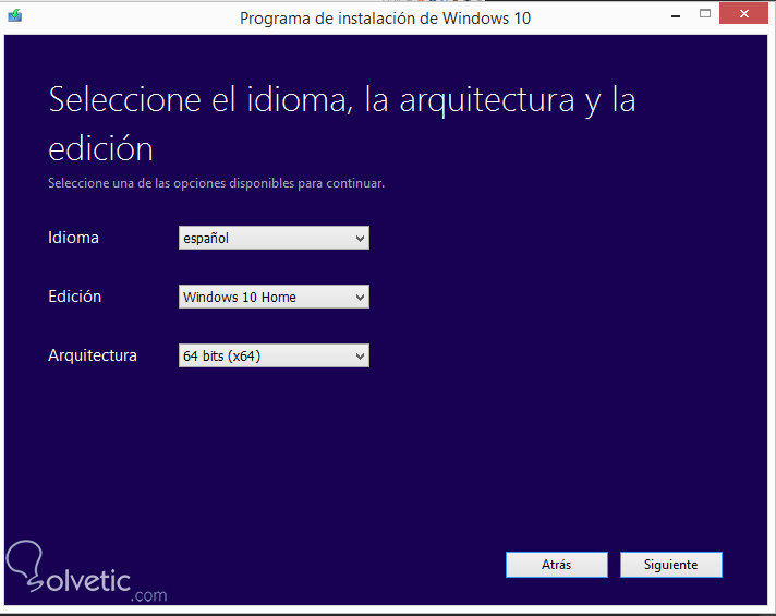 Presionamos “Siguiente” y procedemos a la sección del idioma, la arquitectura, así como la edición. Escogemos lo que deseemos y presionamos el botón de “Siguiente” nuevamente: