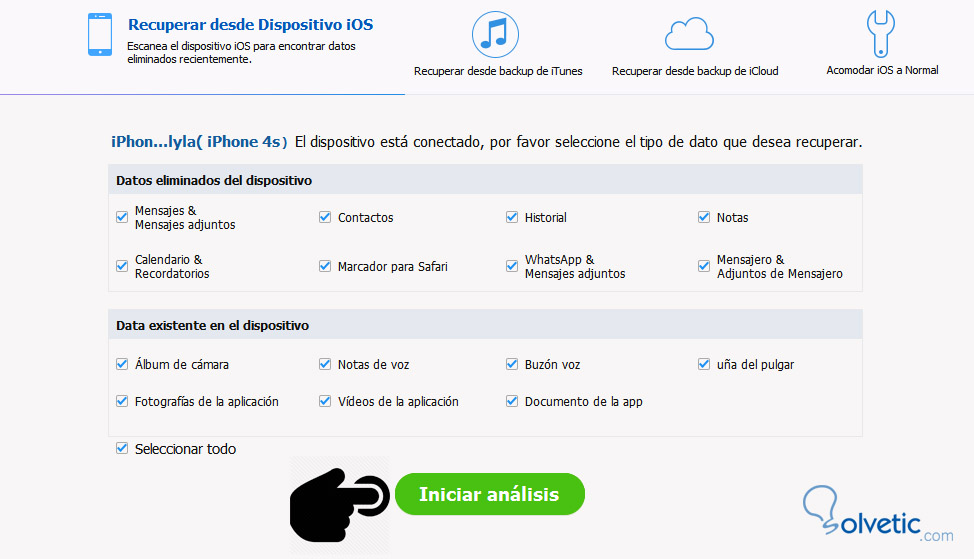 3. Cuando el programa haya detectado el dispositivo podrá visualizar una interfaz en la que podrá seleccionar que elementos de su dispositivo móvil exactamente desea recuperar (mensajes y adjuntos, contactos, historial, notas, whastApp, fotografías, notas de voz, buzón, videos, etc.). Seleccione los elementos que desea restaurar y proceda a hacer clic en el botón “Iniciar análisis”.