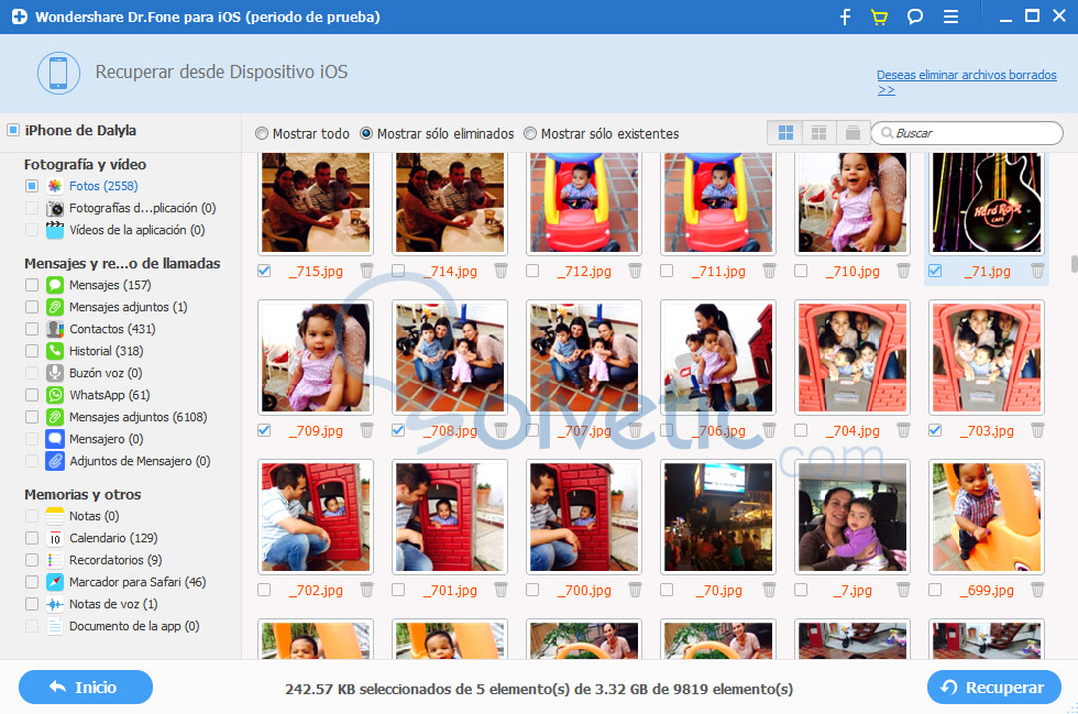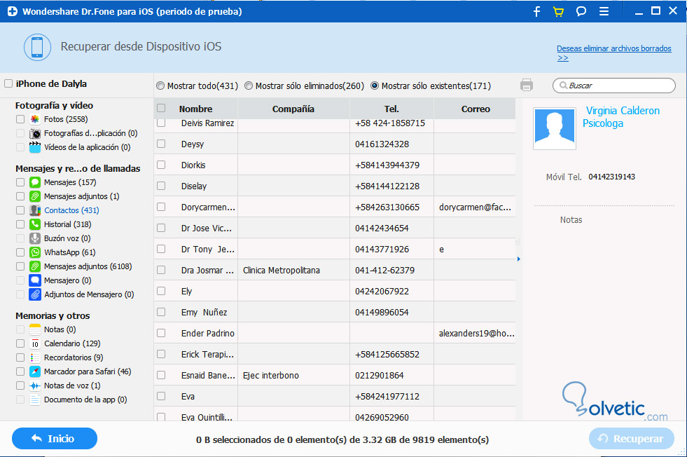 Esta aplicación realiza un trabajo de recuperación exhaustivo de datos que han sido borrados o perdidos en cualquier tipo de dispositivo móvil. Con la instalación de este programa se podrá recuperar: contactos, historial de conversaciones Whatsapp, sms, fotos, videos, notas, enlaces y hasta marcadores Safari.