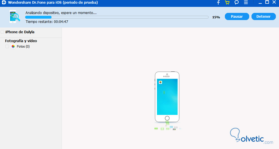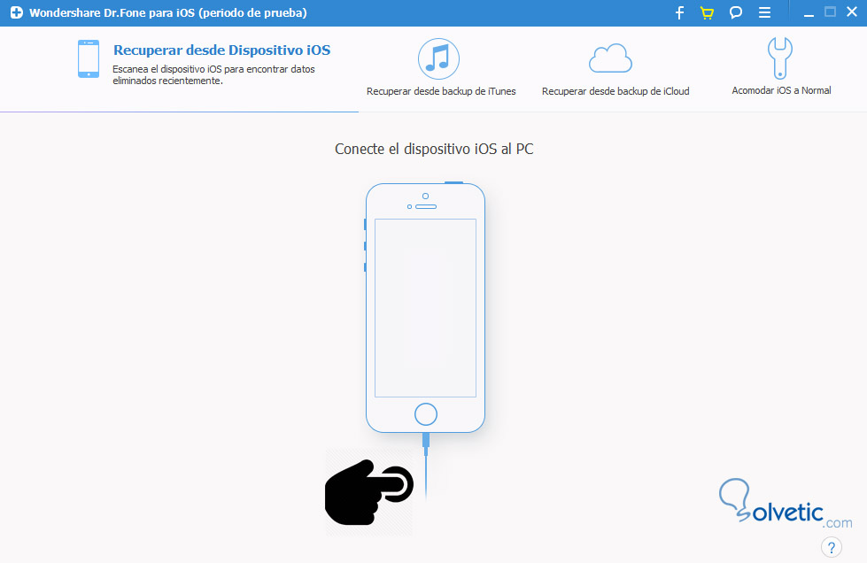 2. Una vez instalado el aplicativo le aparecerá una pantalla solicitando que conecte su dispositivo IOS (utilice un cable USB en los respectivos puertos del dispositivo y del ordenador) para iniciar el proceso de escaneo de los archivos que han sido eliminados recientemente.