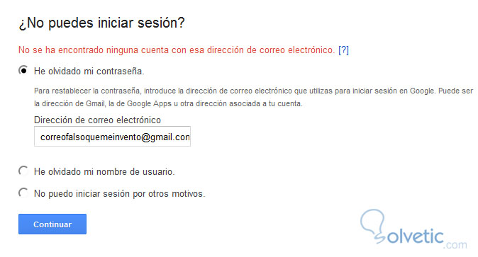 - Como podéis ver en este ejemplo nos dice que no existe poniendo: No se ha encontrado ninguna cuenta con esa dirección de correo electrónico