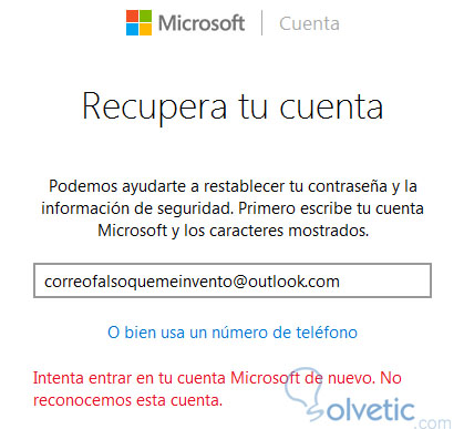 - Aparece para introducir la dirección de correo, escribimos el mail que queremos comprobar si existe que sea de Hotmail u Outlook y nos dirá al instante si existe o no.