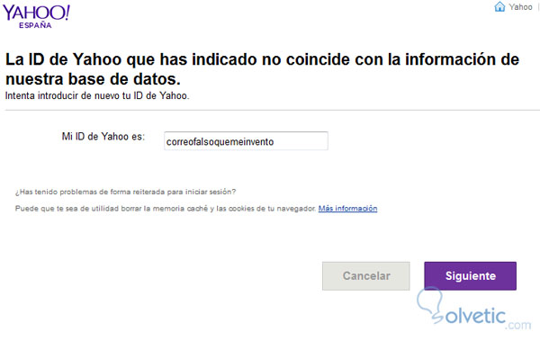 - Como podéis ver en este ejemplo nos dice que no existe poniendo: La ID de Yahoo que has indicado no coincide con la información de nuestra base de datos.