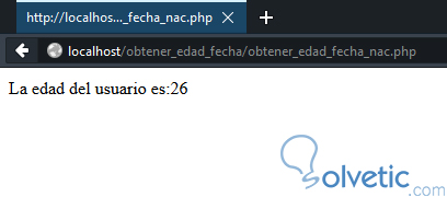 echo "La edad del usuario es: ". obtener_edad_fecha_nacimiento('1988/08/06');Lo que hacemos como mencionamos es utilizar una función para recibir la fecha del usuario y con la función strtotime() convertimos nuestra fecha a un formato más simple para su tratado y dependiendo de las condiciones que hemos establecido retornamos la edad correcta del usuario. Veamos un pantallazo que nos comprueba la funcionalidad de nuestra función:Como vemos es sumamente sencillo y útil para obtener la edad del usuario sin necesidad de solicitarla, solo queda utilizarlo en nuestros formularios y mejorar la experiencia del usuario en nuestras sitios web.