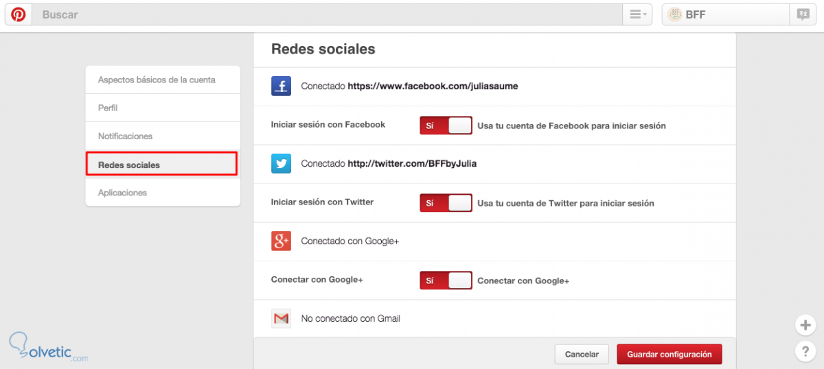 Luego selecciona “Redes Sociales” y asegúrate de conectar las cuentas que desees (Facebook, Twitter, Google+, Gmail o Yahoo):
