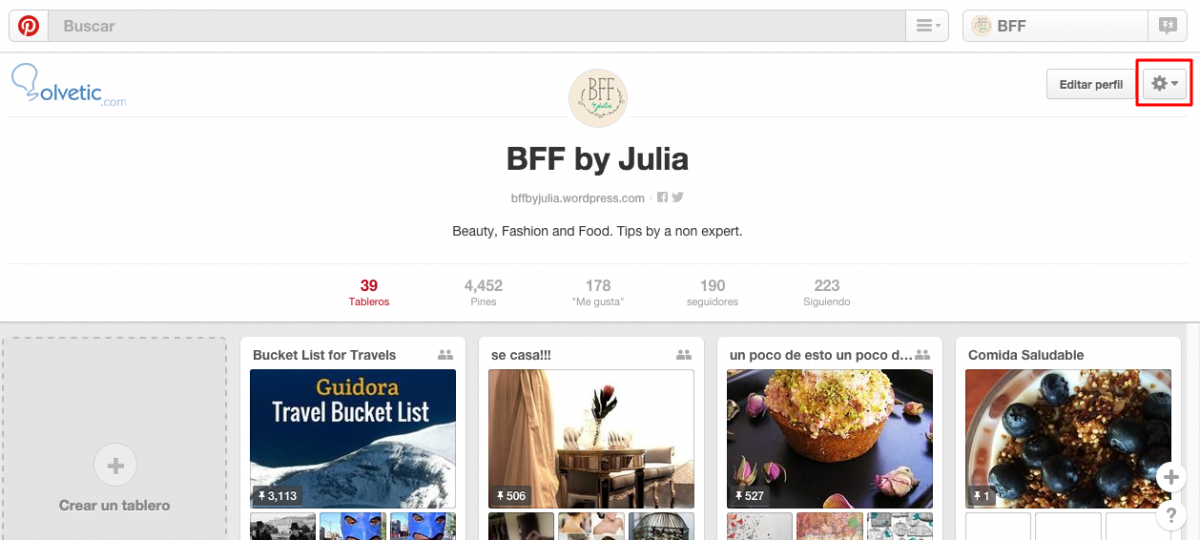 Lo primero que debes hacer es conectar tu Pinterest con tus otras cuentas de redes sociales y, si lo deseas, con tus cuentas de correo electrónico. Esto lo haces yendo a tu perfil y haciendo clic en el icono de la tuerca:
