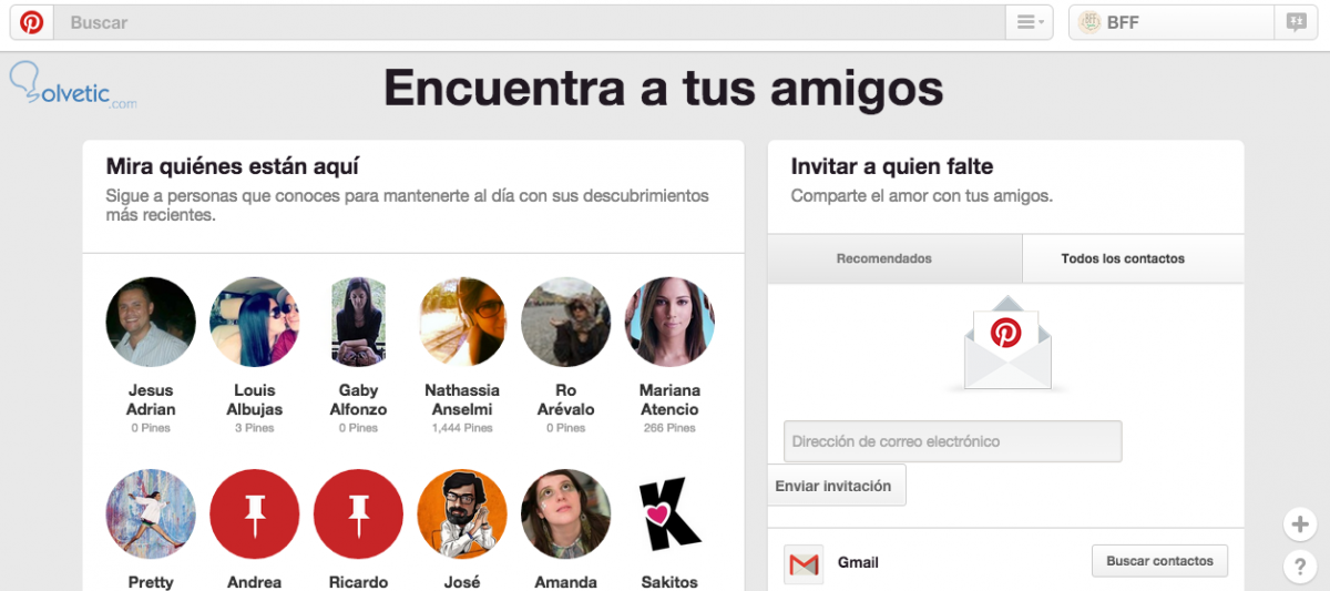 Esto automáticamente te mostrará a las personas que sigues, tienes amistad o están en tu lista de correo en tus otras cuentas de redes sociales o e-mail, pero que aún no has seguido en Pinterest: