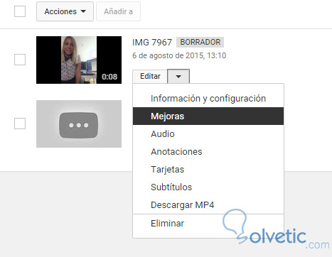 6. Una vez nos encontremos en nuestro vídeo, desplegamos la pestaña editar, y nos vamos a mejoras.