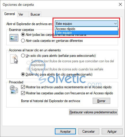 3. Dentro de la opción "Abrir el explorador de archivos en" podrás seleccionar entre las dos opciones comentadas (Acceso rápido / Este equipo). Seleccionas Este equipo si quieres modo completo.