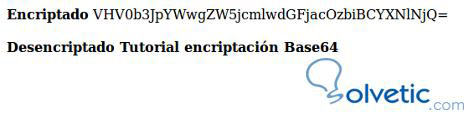 <?php $text = 'Tutorial encriptación Base64'; ?> <?php $encriptado = base64_encode($text); echo "<strong>Encriptado:</strong> ".$encriptado ."<br><br>"; $desencriptado = base64_decode($encriptado); echo "<strong>Desencriptado: <strong> ".$desencriptado ."<br>";