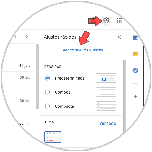 Nos dirigimos a nuestra cuenta de Gmail y del lado derecho buscamos el botón de herramientas identificado por un engranaje, desplegamos y en las opciones presionamos "Todos los ajustes"