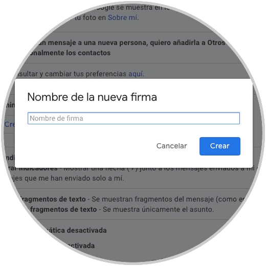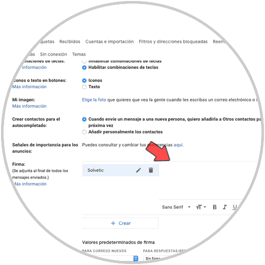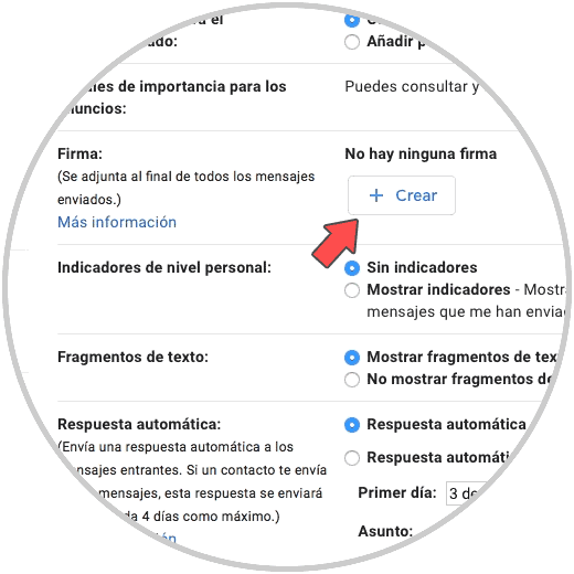 En la pestaña de General nos desplazamos a la parte inferior y buscamos la sección de Firma, allí tendremos que pulsar sobre "Crear"