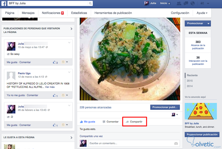 Hasta cierto punto esto ayuda a darle visibilidad a las publicaciones de tu Página porque tus amigos de Facebook podrán ver las cosas a las que le das “Me Gusta” o comentas. Lo que sí es cierto es que estas interacciones son ahora menos visibles que antes, y la mejor manera de hacer que tus amigos vean algo es mencionándolos en un comentario de la publicación, o mejor aún, compartiendo la misma en tu muro para que la vean todos tus amigos. Para esto, haz clic en “Compartir”