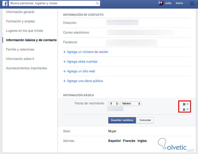 Y editando las opciones de privacidad. Por ejemplo en este caso, yo he escogido que mi día y mes de nacimiento puedan verlos solo mis amigos (puede verse el icono de amigos al lado de la fecha), y el año solo yo (puede verse el icono del candado).