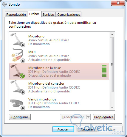 En el ejemplo que os mostramos tenemos un ordenador portátil con Windows 7 que tiene 3 opciones de micrófono que podemos activar o desactivar: