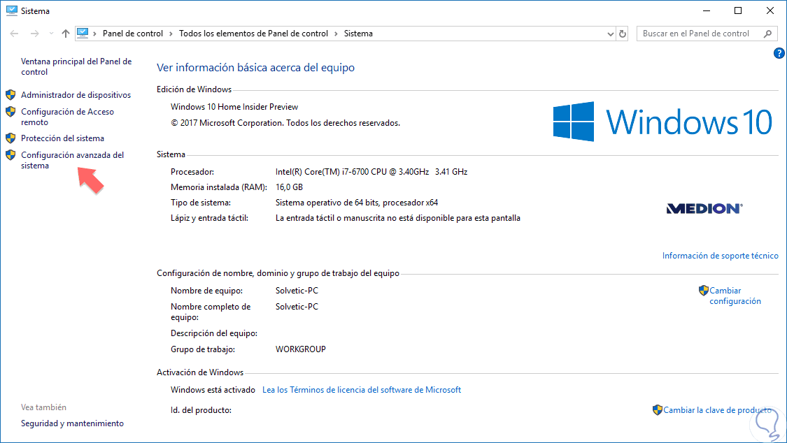 Pulsamos en "Configuración avanzada del Sistema".