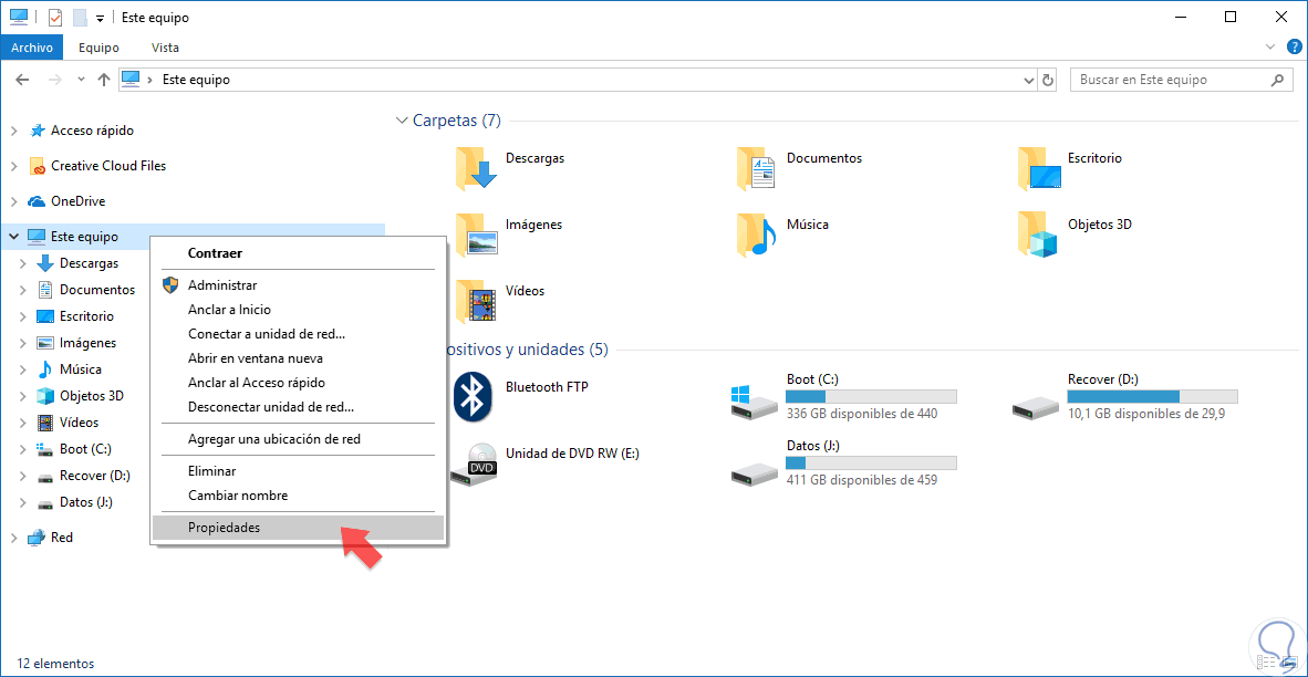 Nos dirigimos a la sección de "Este equipo" y hacemos botón derecho sobre él. Seleccionamos "Propiedades".