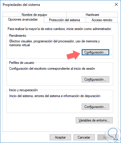 Dentro de la pestaña "Opciones Avanzadas" en la sección "Rendimiento" pulsamos el botón "Configuración".